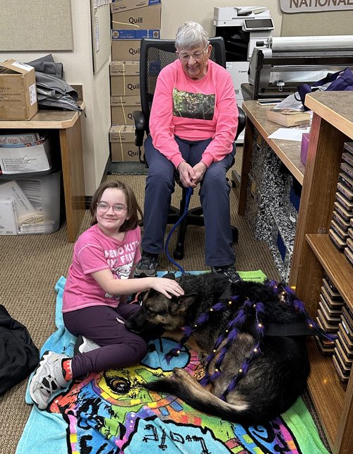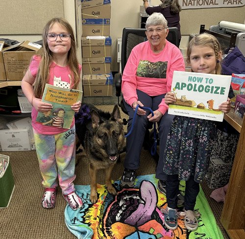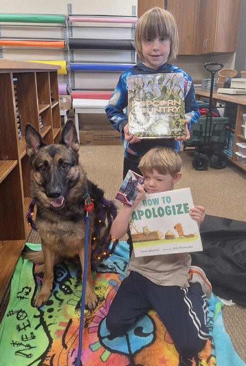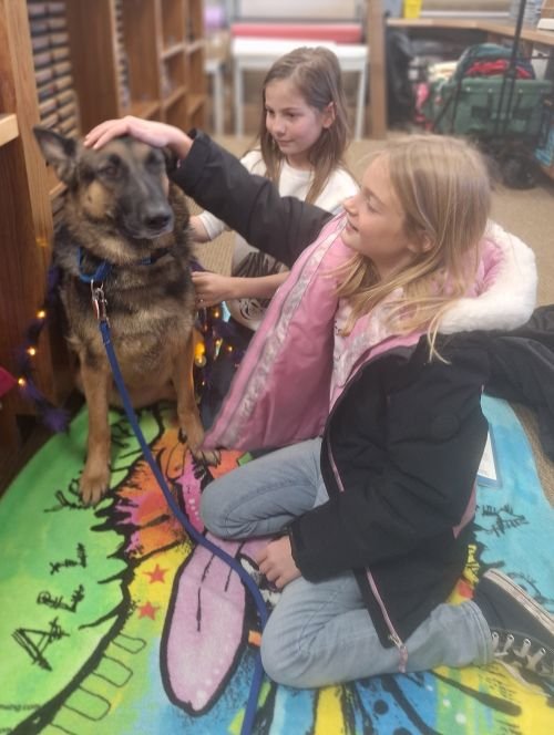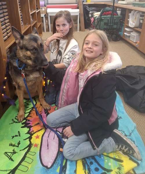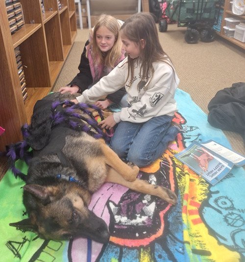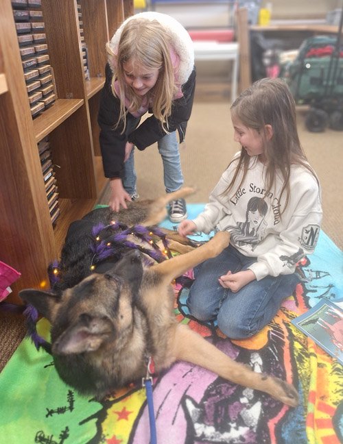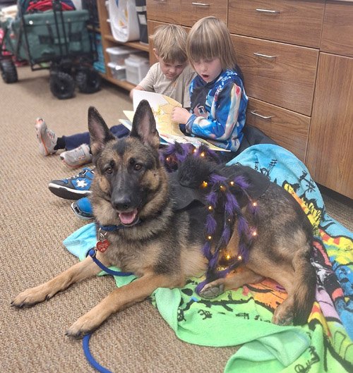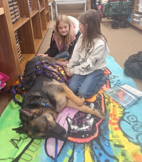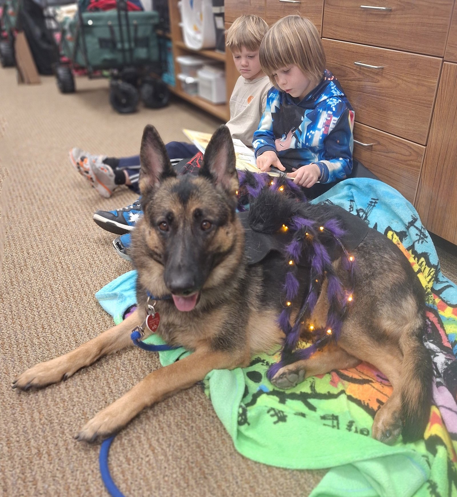 My Hopeful (5 years 5 months old, SS litter) had fun wearing the spider costume during Reading Dog at Tongue River Elementary.