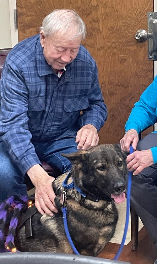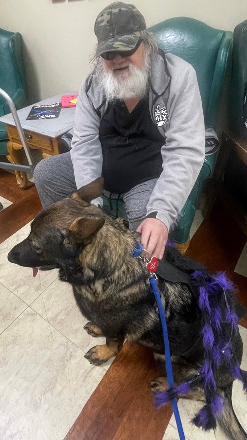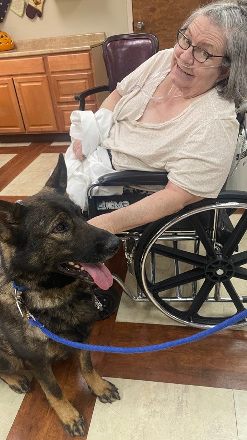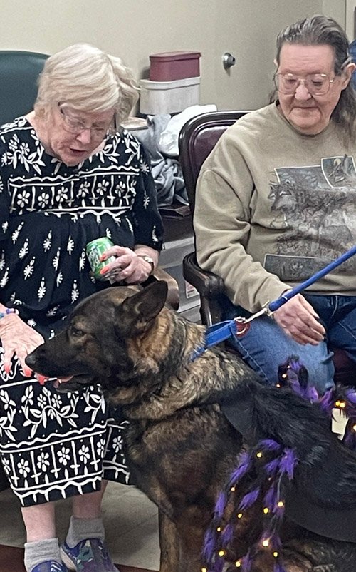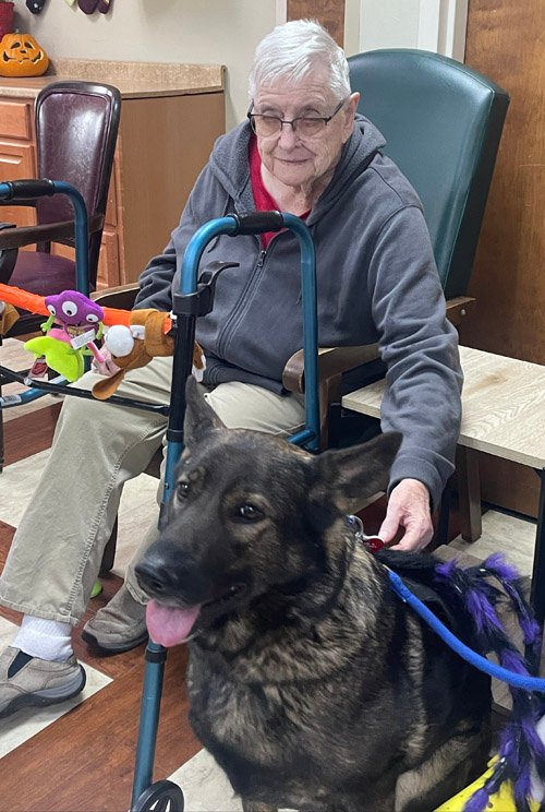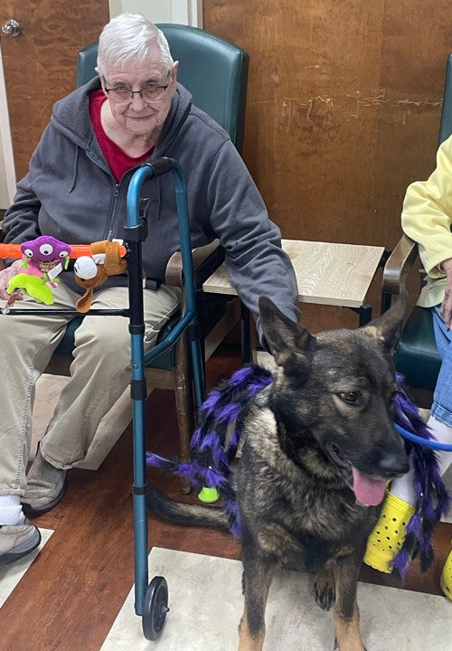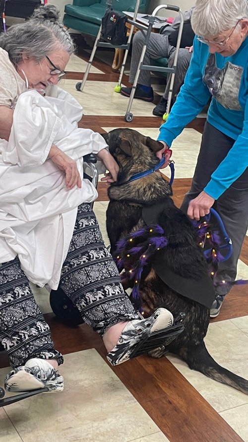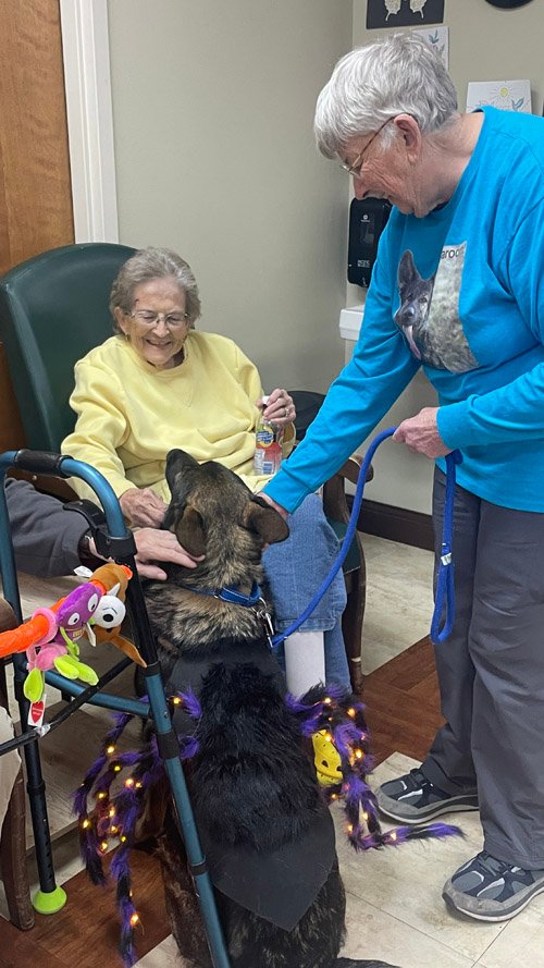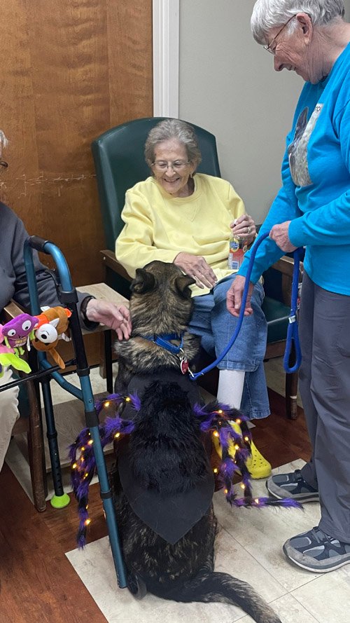 My Pascha, who is from the YY litter, is 2 years 6 months old and wore a costume for the first time on our therapy dog visit to Green House Living. A resident was so excited about it that she brought out HER spider (silver & fuzzy) and put it on Pascha’s rump. Pascha walked around with it; she could have cared less. She was such a good sport on her first experience of wearing a costume. I was very proud of her.