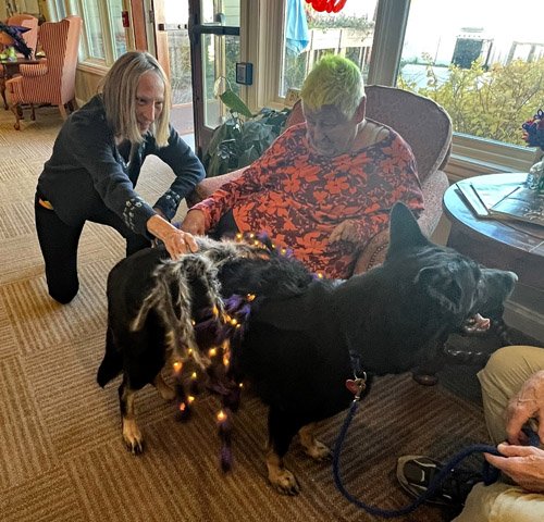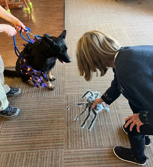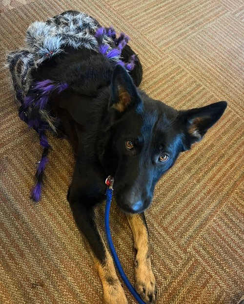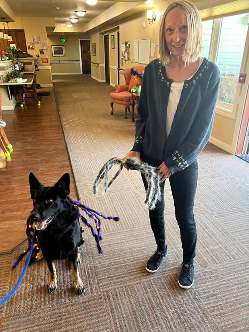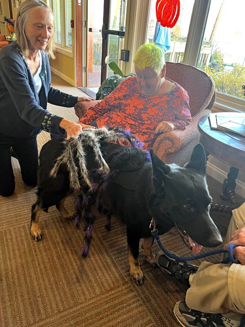 My Pascha, who is from the YY litter, is 2 years 6 months old and wore a costume for the first time on our therapy dog visit to Green House Living. A resident was so excited about it that she brought out HER spider (silver & fuzzy) and put it on Pascha’s rump. Pascha walked around with it; she could have cared less. She was such a good sport on her first experience of wearing a costume. I was very proud of her.