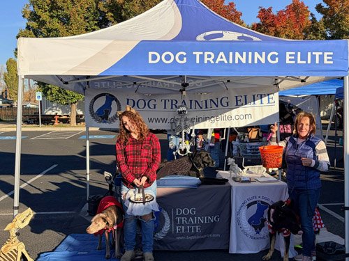 Rainey did fantastic at the costume event in Utah. She represented plus Dog Training Elite at the last Farmer’s Market of the season. Debbie commented, “Everything was pretty crazy, but Rainey did fantastic! She is really starting to know her job (she’s training to be a therapy dog.) It was so busy that it was hard getting photos. I managed to photograph the ghost (2nd photo) but failed to get a photo of a seven-foot-long wolf with fangs and claws as it petted her. It was pretty scary but it didn’t faze her.” Rainey is in the shadows on the right in the booth photo. Can you find the black dog lying on the table? He sure blends in…