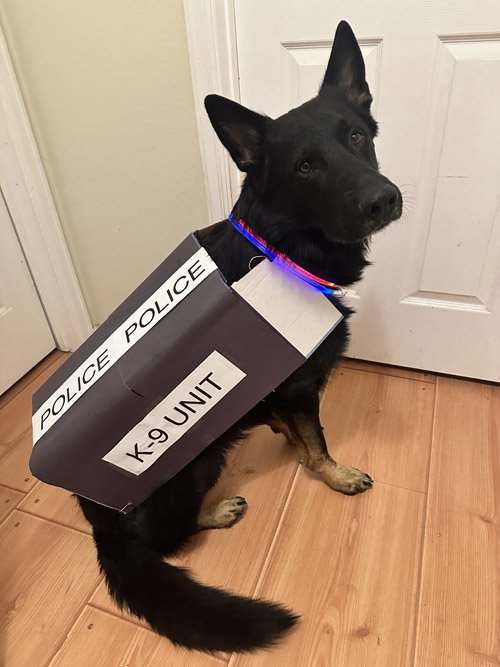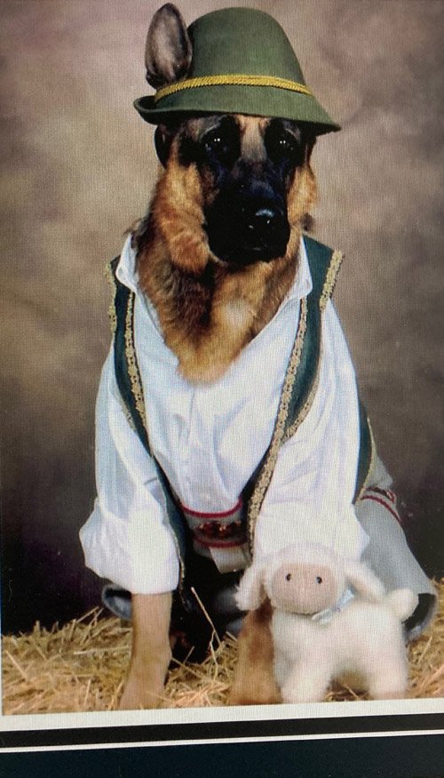 Before I show photos of my pups, Cathy, who has Charis from the JJ litter and Breeze from the ZZ litter, wrote that she doesn’t dress up her dogs anymore, but she sent a favorite Halloween picture of her beloved Cody from 30 years ago, dressed up as a German shepherd for Halloween. It’s such a cute costume, I asked her if I could include it on my Halloween page.