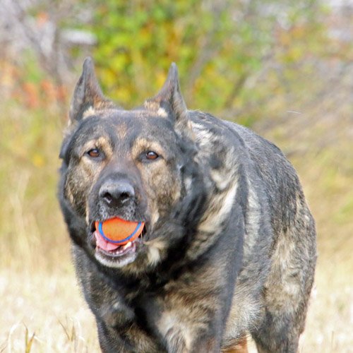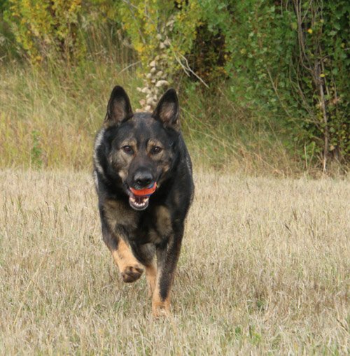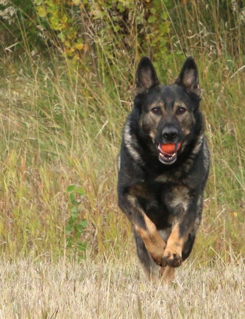 Justice is faster than my old girl and often grabs her ball and packs it around, holding both it and his ball in his mouth until I rescue Lovely’s ball and return it to her. Sunday, though, he got quite the comeuppance when his ball bounced right at Lovely and she captured it, lay down and alternated chewing on it and her own ball, staring him down any time he got close and tried to get his ball. I laughed and laughed at Justice, who thought he was really abused. He couldn’t believe that he was being treated that way and kept giving me very mournful looks. I let him stew for several minutes before I called Lovely to me and he was able to zip in and grab his ball. I even got photos!
