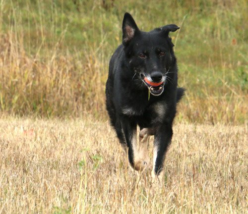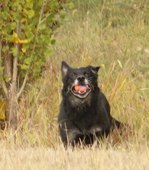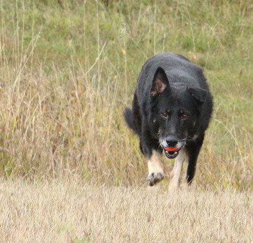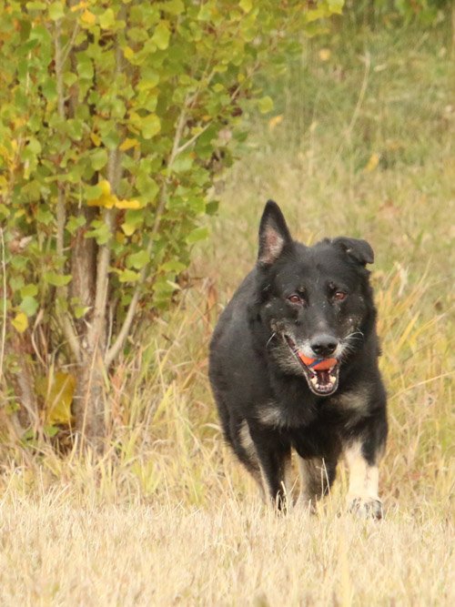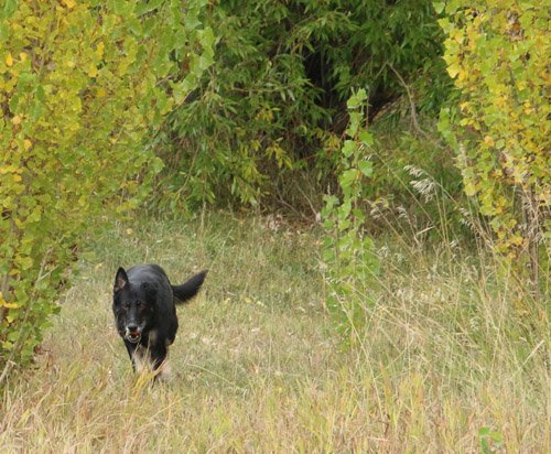 I hoped to get photos of my crew before the fall colors were over.  Two weeks of heavy rain didn’t help any, but I finally had a day of decent weather when I was home, so I tried.  There wasn’t a lot of tree color yet, but the grasses around my fence-post pile had dried to a beautiful light-gold color that sure captured the sunlight. I hadn’t been able to get a handyman all summer, so the grass hadn’t been cut down, which I usually do to prevent the dogs getting grass seeds in their ears.  To get the colors AND have the sun behind me, I had to use an area that slopes downhill.  It did make for some interesting photos of them coming uphill!