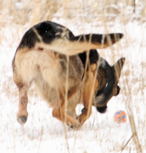 A lot of the snow melted yesterday. What didn’t, froze into clumps or slick patches of ice. I had to throw the ball the opposite way – up the hill – so that the dogs had the best traction as they sped after the ball (up the hill) and then returned more slowly with it and watched their footing. The light was a problem, so the dogs are a little dark in some of the photos as sun behind them broke through the clouds and created a glare. They played safely, though, which was more important than perfect photos