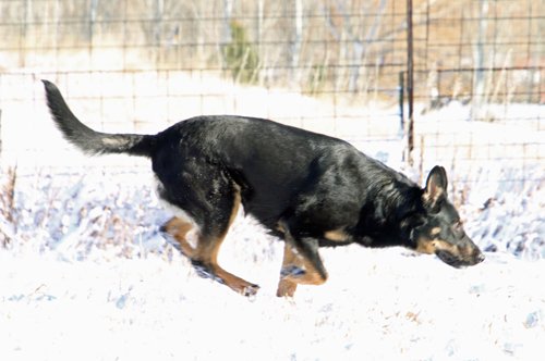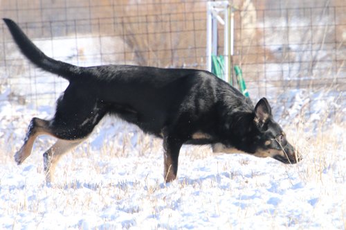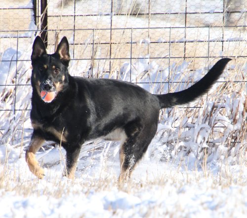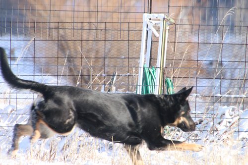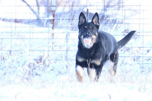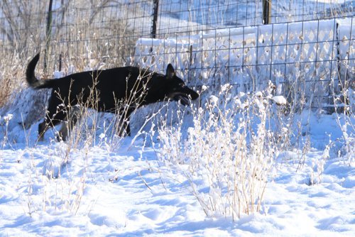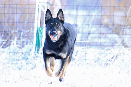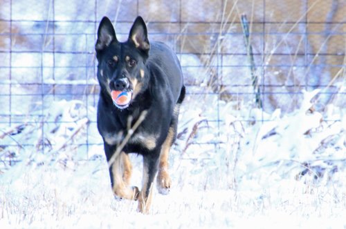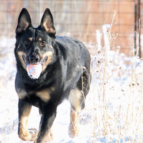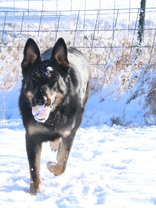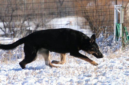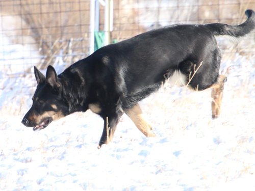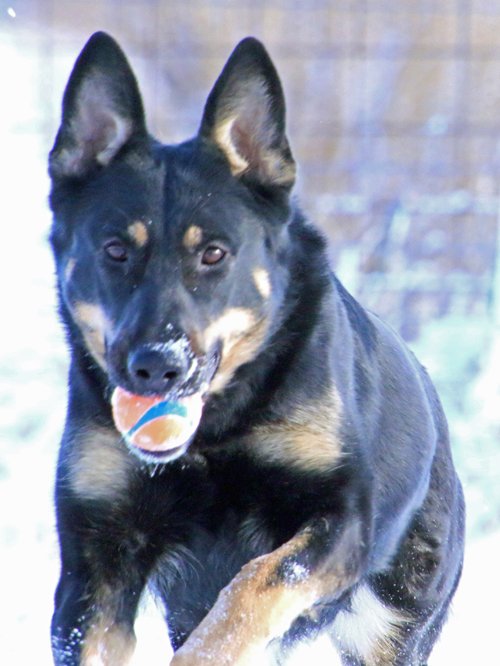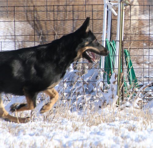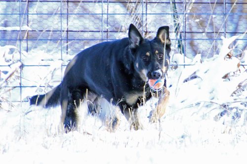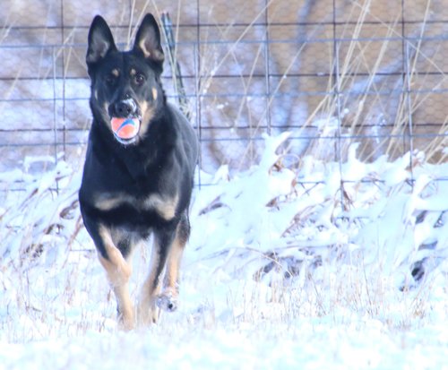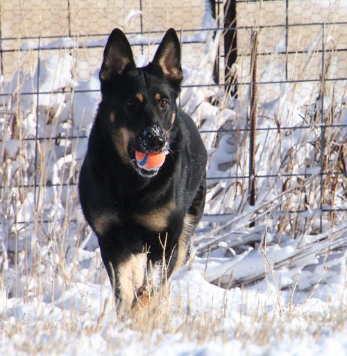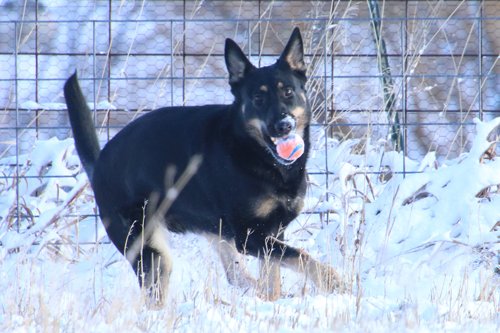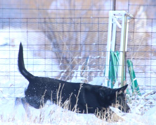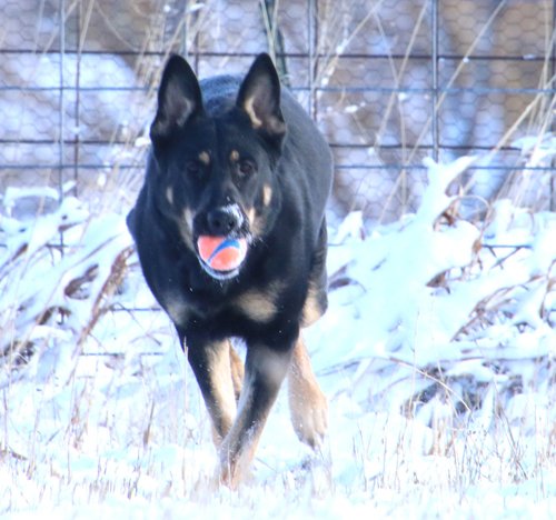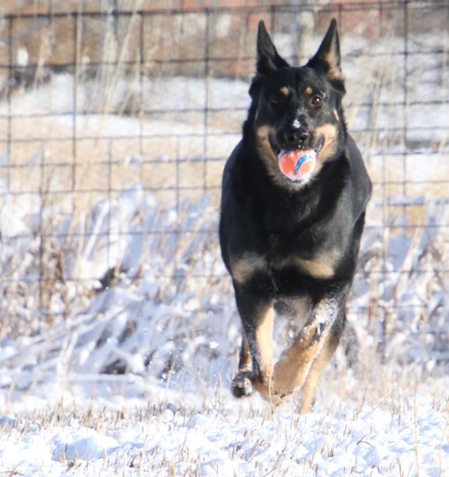 Zeal is built differently and moves differently than any GSD I’ve had. She’s usually quite graceful, except when she’s using her nose. Then she seems to forget where her legs are.  I caught a bunch of photos of her in that non-graceful stage, as she was searching for her ball.  What I didn’t get, and probably never will unless someone comes to photograph as I throw the ball, were the kangaroo leaps she makes as I throw the ball and she’s trying to follow its passage through the air. I got a lot of search photos because she kept taking off before I threw the Chuck-It and didn’t see where the ball went.  A few times I had to go out and show her the general area to search.  She’d find it and race me back to my chair and wait for me to get there to throw it again.  A couple of times the ball bounced into the puppy obstacle run I have gates at each end so the big dogs can access the run when a ball goes in there.  I got some good photos of her trying to figure out to turn away from the ball in order to get to it – and then proudly exiting the run to bring me the ball.