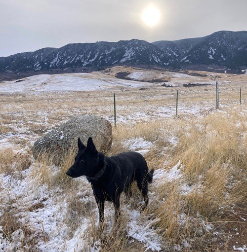 Photo 1: “Photo from our run this afternoon. 11 antelope just flew by from the right to over the horizon. He took off after them but came back nicely.”