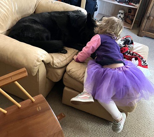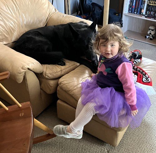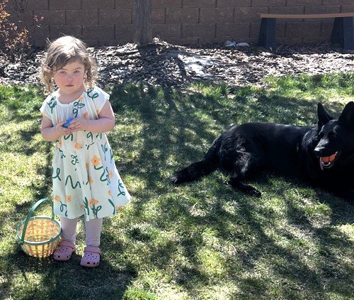 “Scully is doing great. We celebrated her birthday with some new frisbees, balls and a knuckle bone. She was in heaven. She’s shaping up to be the perfect big sis to my little one. Attached is a recent pic of her being very patient while my daughter played dress up with her. Hope all is well! Please give the pups an extra snuggle for me.”