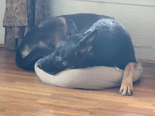 “My kids flew me (home) to Sweden for a month-long stay. Sophie got to stay in a highly-recommended kennel where, I’m told, she enjoyed herself very much. She got to run and play with a variety of other dogs, ran perimeter checks and generally enjoyed her stay. After a month, our reunion was, frankly, cataclysmic!! My watch was sure I had fallen, and there was hair everywhere. In a massive understatement, the kennel owner said she might need some brushing. I guess! I really enjoyed my time in Sweden, but I was glad to get home. The first photo was shortly after we returned home.”