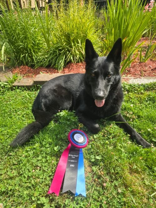 8/24/25: “Taryn was spot on finding all 10 hides -she showed such confidence in this Trial-not worried about shiny floors or distracted from her job. I blew it for her …we did get a leg toward our 2nd NW3. For this level you need to pass 3 NW3 Trials -6 searches all 0-3 unknown. If you make 1 mistake you get a leg. 2 legs = a Title. I kept her in the blank (no odor) vehicle search too long & I think she got bored & played around with a grate on the back of a trailer, & stupid me called it. Ugh. She is an angel I can’t tell you how many people come up to her & just love her -she is a fabulous ambassador for the breed. Great traveler in the car & motels too.”