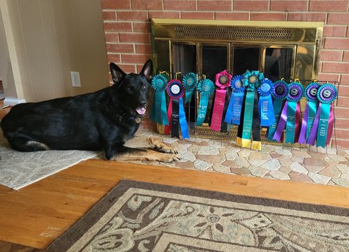 “Sorry I haven’t been in touch. Things have been hectic. Have 5 weeks straight of trials with Kellan. Here is a photo of all his ribbons. Most are from his NW3 trials. Titles and placements. Others are from AKC and USCSS. There’s a k9 cop that is a judge for NACSW. He things Kellan is amazing. He said all I would have to do is get him out of my car.”