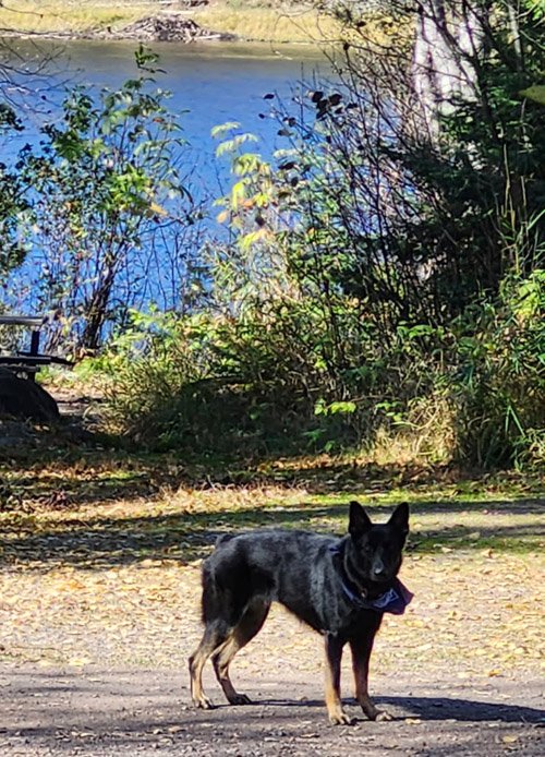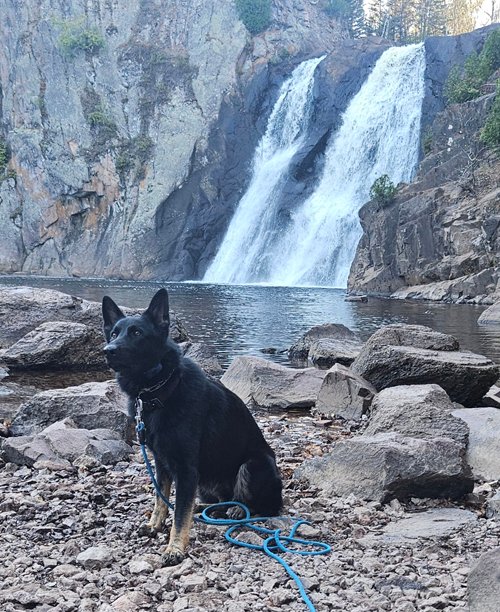 Photos 2-4: “Tettegouche State Park. This is the Baptism river. It feeds into Lake Superior. Rather long, steep arduous hike to the waterfall. Jiva was zonked after two long hikes today. We were too!! Both J and I exhausted after 3 days up north! I think yesterday 4 hours rigorous hiking!!! One hike was relatively short (2 miles) but thick forest with barely visible path. No other humans around in this forest. Jiva off leash. She would go ahead about 75 ft, stop and then run back to us. I think she did 10 miles. Hike to water fa ll with steep inclines. She was out of her mind with new smells and adventures. What a blast for her!
