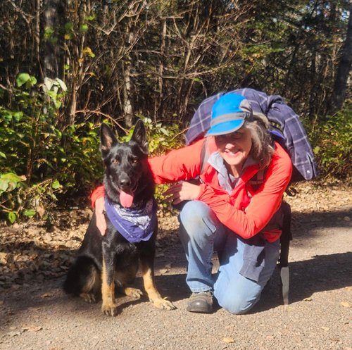 “Tracking test the end of October. I’m having fun training her. She is such a happy, at times naughty, entertaining pocket rocket. With an off switch. (I installed it – and it works beautifully. We had a wonderful hike today.)”