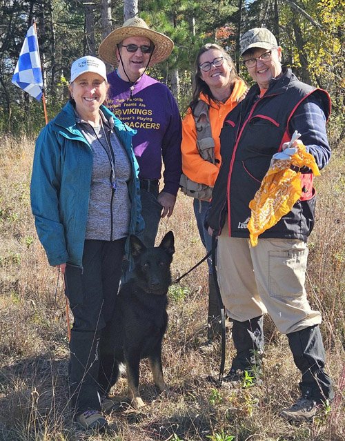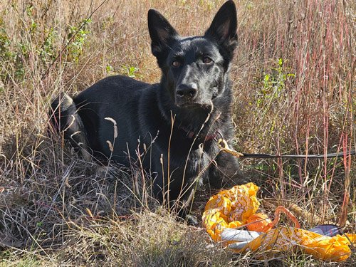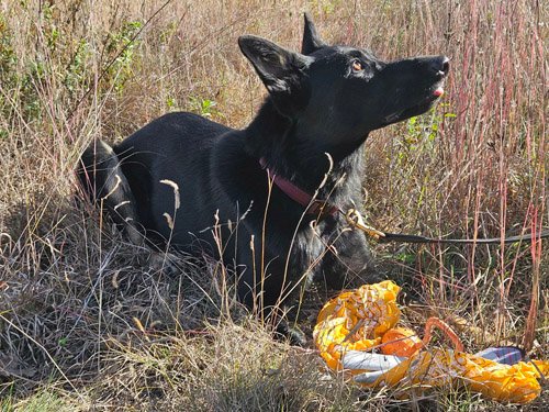 Photo 6: “We passed our certification track this morning in knee- to waist-level prairie. It went well, except this particular field had many ground-level vines!! I nearly fell laying the track and then running Jiva on it. Whoa! She needs to go my pace but sometimes that’s so hard for her. The tester is also an AKC tracking judge. She said she was looking forward to seeing Jiva today as she had laid a blind track for us earlier. Jiva did fantastic!! Nailed all the corners, steady pace, confident dog. The judge was so impressed with this shepherd of mine! She suggested we try for TDU also. October 19 is our TD test. Handling Jiva today was a breeze. She was so confident and committed. In one area she circled a bit for whatever reason, otherwise she was exactly on the track the whole time. Jiva wasn’t impressed with no reward at the articles and had to settle for my happy praise and petting. Back at car, her toy, tug and some light fetch. VERY proud of her!!!!”
