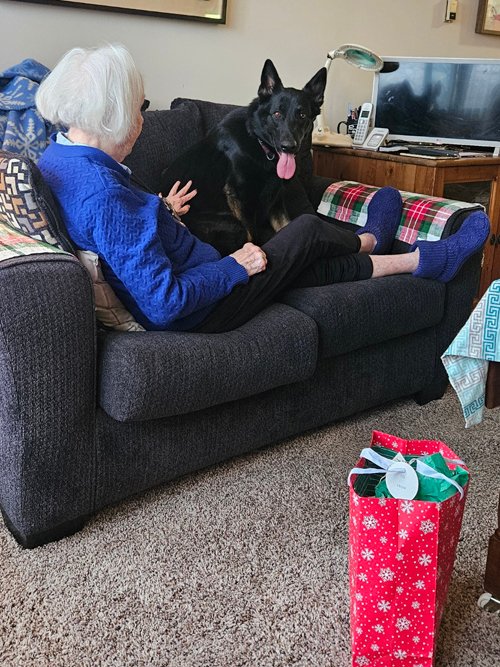 10/19/25: “Jiva passed her tracking test! Only 2 of the 7 entered passed. Judges commented on how well she did! (Cel’s note: A dog earns a TD by following a track 440 to 500 yards long with three to five changes of direction and usually changes in terrain (open land, trees, different grass, etc.). The track is laid by a human tracklayer and is “aged” 30 minutes to two hours before the dog begins scenting. The goal is to use the scented track to locate an article (a glove) left at the end of the trail by the tracklayer. The owner follows the dog on a long leash. There is an article at the beginning of the track too in this case a yellow bandana. It is an exacting test, and the judges complemented Jiva and her mom, Sarah, for a fantastic job.) “Corners were crisp, nose down with a few head checks. Great pace. My only “angst” was after long walk in, we had to wait 15 minutes as previous dog needed extra time. Jiva was initially wired for bear and then chilled and lay down as we waited. When judges arrived I gave her another cue, my usual i had already given Are you ready to track? Clipped leash on harness. And went to start. It seemed that “chill time” made her settle calmly right away at a good pace. So it wasn’t the problem I thought it would be. I also petted and praised her a bit longer at the start. There was a turn in small grove of trees that she circled to work the scent. Really a spectacular tracking performance! So damn proud of us!!