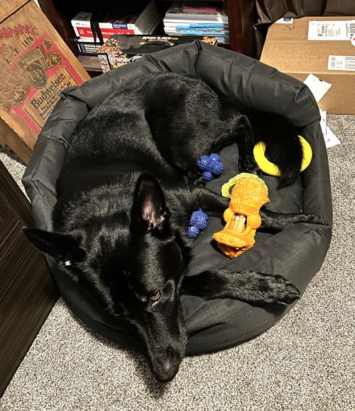 “Cel! This is Jenny Jones and I got your Christmas newsletter. Zeke is doing great. We got to go camping A LOT this summer and the loves swimming in all the lakes with my golden retriever. He is a good boy with my four kiddos. Very patient with them and absolutely loves it when he gets to snuggle with them on their beds at night when we read. He is usually pretty aloof but recently has been asking to come up on our love seat when my husband and I are watching tv after the kids go to bed he just sort of slowly crawls up there and scooches in in the middle of is to snuggle in for some cuddles. It’s pretty adorable. Hope you had a good Christmas!”