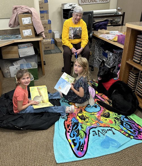 10/20/25:  Pascha at Tongue River Elementary  We don’t have many kids signed up for Reading Dog this year, so I take just one dog each Monday instead of 2.  Pascha replaced Spirit, who had to retire due to arthritis.  It was Pascha’s turn to do Reafing Dog on October 25th.  One of the secretaries, Jackie, remembered to take a photo.  Jackie came into our room from the rear, so the girls and Pascha had to turn around.  I was impressed that all FOUR of us are smiling in the photo!