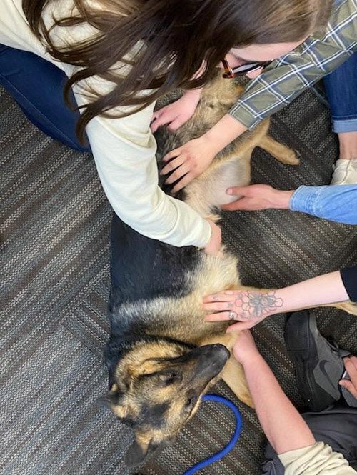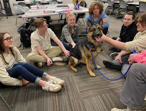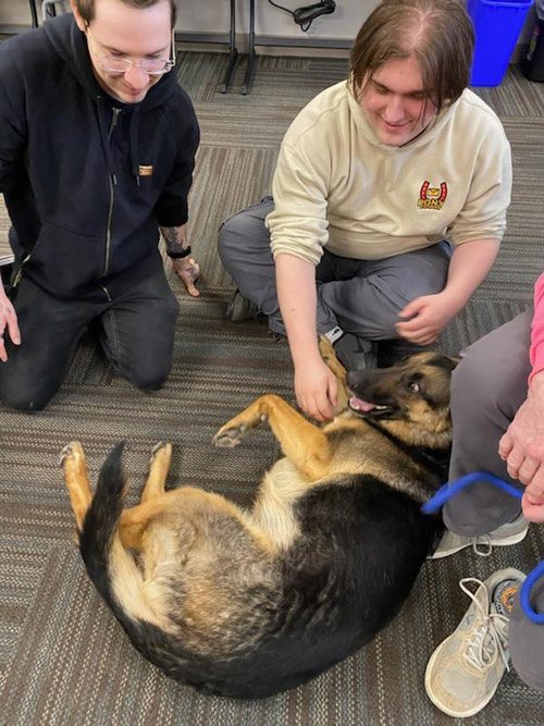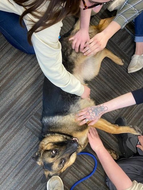 4/8/25: Hopeful and I were asked to de-stress music students at Sheridan College just before finals. We did a stress-relief visit to that class in December just before they took semester finals, but the professor forgot to take photos. Now the kids are getting ready for the big finals – and some are graduating – so we were asked to come back for another visit. This time, the professor remembered to take pictures, so you can see Hopeful in absolute heaven having her tummy rubbed. Look at her smiling expression in the last photo!!!
