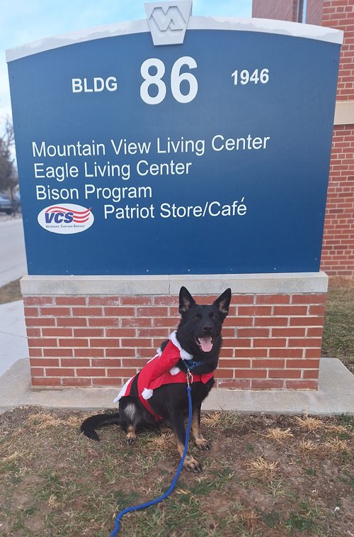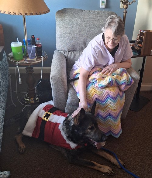 12/24/25: Pascha (2 years 8 months) on a Christmas Eve (morning) therapy dog visit to the VA. I stopped by PetCo on Monday to see if they had any Christmas costumes, since I had used our “Christmas gift” costume everywhere this year. I was amazed to find a cute Santa costume large enough to fit a German Shepherd – and it was on sale!