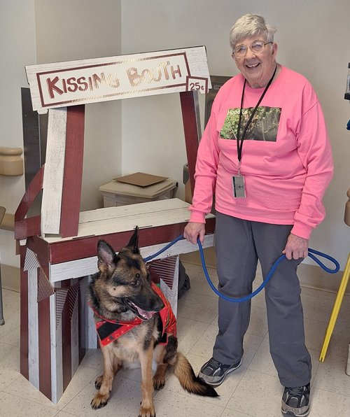 3/6/25: Hopeful and I on a therapy dog visit to Green House Living. The hospital’s marketing person happened to be there to do a feature on Green House Living (Sheridan Memorial Hospital recently took over Green House Living). She followed us around on part of our visit. She even got a photo of Hopeful being blissfully happy because one of the residents could rub her tummy (so many can’t).
