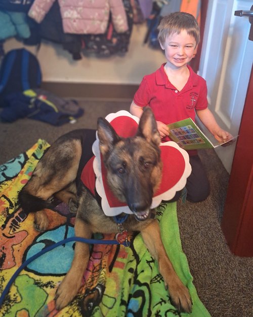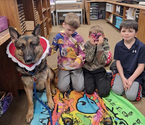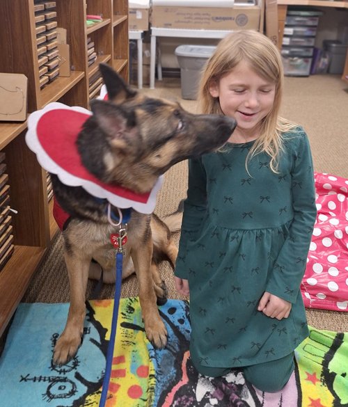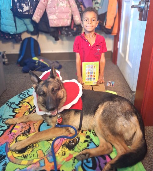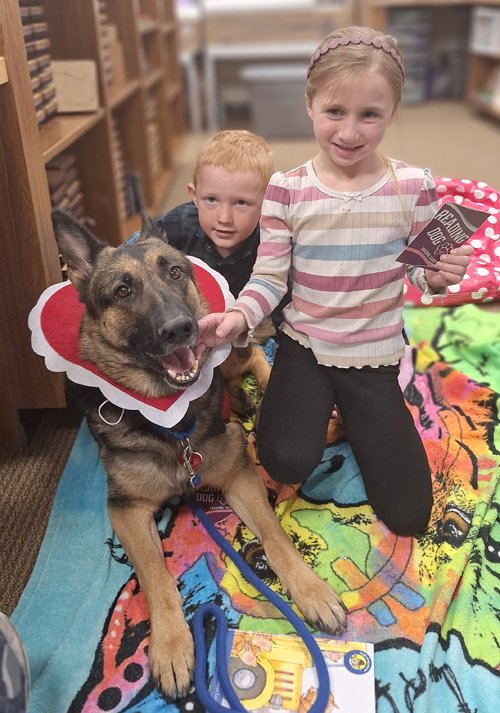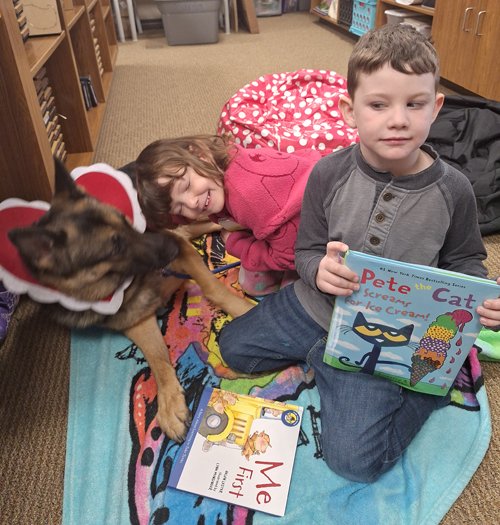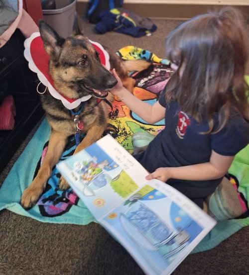 2/9/26 & 2/12/26: Hopeful doing Reading Dog in her Valentine’s Day costume with the Tongue River Elementary kids and the Holy Name School kindergarteners