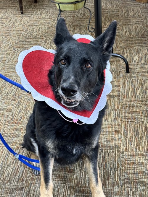 2/9/26: Lovely and I on a therapy dog visit to Westview Healthcare Center during Valentine’s Day week. As I was logging in, one of the staff members came uo and exclaimed about how cute Lovely’s heart was and that she HAD to take photos. I laughed when I saw this one that she took because Lovely is clearly saying, “OK, let’s start visiting!” She is SUCH a tease, and this photo shows it.