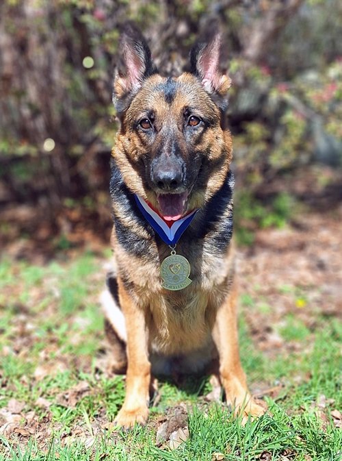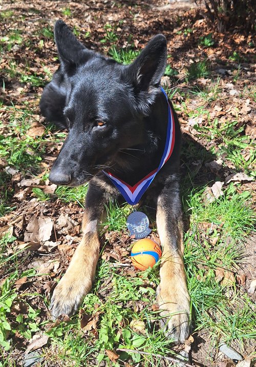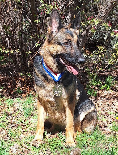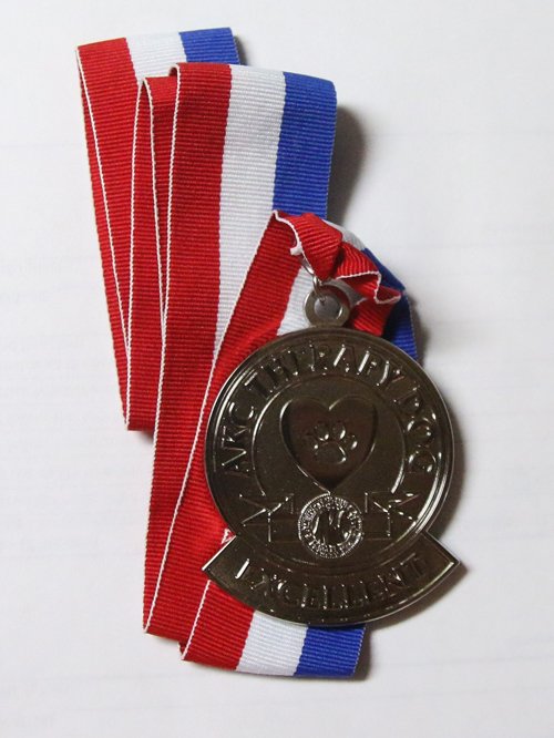4/12/26: Lovely and Hopeful earned their Therapy Dog Excellent (THDX) title, which requires 200 visits. That award includes a nice medal. When it came, I took photos of both girls wearing their medals.