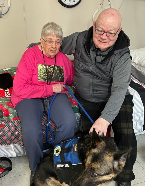 4/8/26: April is Volunteer Month. The VA activity director took a photo of Hopeful and me visiting one of our favorite veterans.