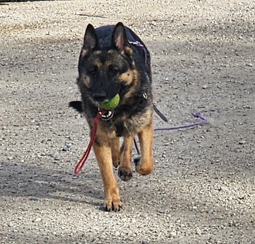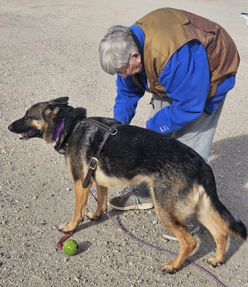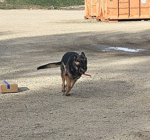 We set two separate search areas. All the dogs do search 1, then we move to search 2. You can usually tell the end of one search if you see some ball retrieving. The start of the dog’s second turn is indicated by practicing an indication on a box as a “warm up,” putting on the harness and/or going through the two plastic cones that in a trial are used to start timing the search.