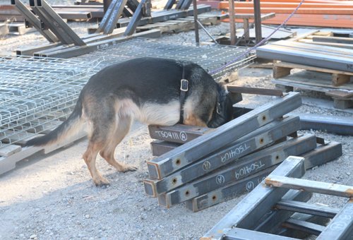 My friend, Denise, and I are training every weekend at our favorite place, the storage yard at Craftco Metalworks.  They are always moving completed work out and bringing in supplies, so new places to hide scents are everywhere.