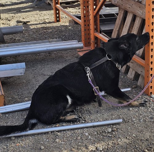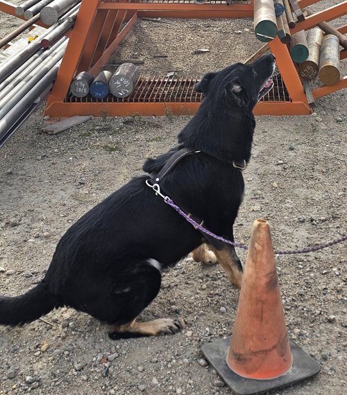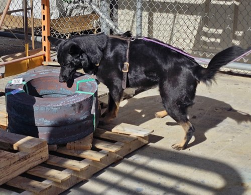 My friend, Denise, and I usually spend the summer training every weekend at our favorite place, the storage yard at Craftco Metalworks. They are always moving completed work out and bringing in supplies, so new places to hide scents are everywhere.